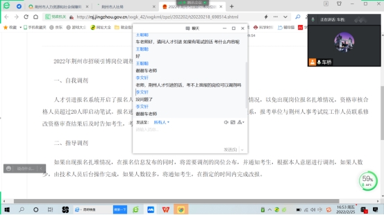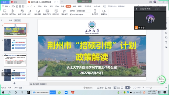 (通讯员:车桥)为精准把握荆州“招硕引博”政策,提升best365英国体育在线2022届硕士毕业生高质量就业率和留荆率,2月25日下午,通过腾讯会议召开荆州市“招硕引博”政策解读及留荆就业工作推进会,2022届全体硕士毕业生参会,会议由辅导员车桥老师主持并主讲。