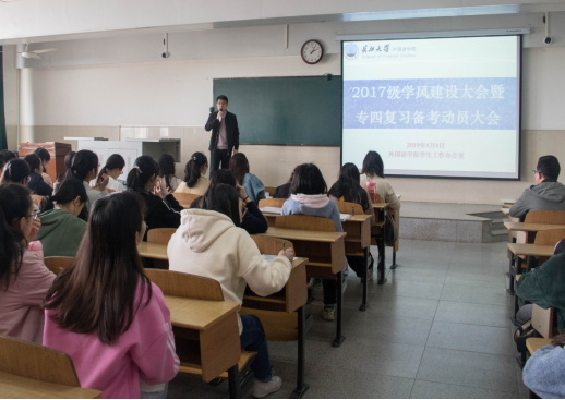 (文/李文佳 摄/吴一楠)44日下午两点,公司12-4022017级年级大会。本次大会主要围绕学风建设以及专四复习备考动员两个方面展开,由车桥老师主持,公司党委副书记张涛老师、马欣老师张晓莉老师、雷难老师、龚频老师、李福兴老师、16翟倩周梦悦同学以及2017354名本科生参加。