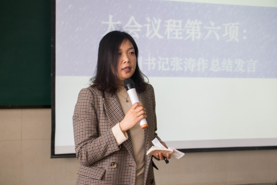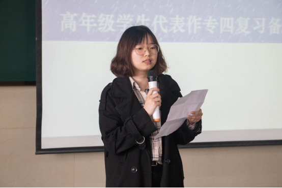 随后,高年级员工代表向同学们分享了关于专四复习备考经验。他们主要从个人的备考经验和班级备考经验两个方面进行了讲述。日语语言11601翟倩建议同学们:少想多做,调整心态,拒绝自怜和焦虑情绪,不假努力,不自己感动自己。并从单词、语法和真题学习方法三个方面进行了分享;建议班级每天有计划性地听写单词,开展班级内部专四动员分享会,或者分组学习。周梦悦从各个题型上向同学们给出了建议。她认为:语法需注重特殊用法,错题要吃透,写作要从结构、观点和用词三个方面把握。论点简短有力、切入点独到、阐述清晰才是一篇好作文的特征。要用批判的眼光研究和学习范文,而不是整篇背诵;班级的备考则要注重跟着老师的节奏走