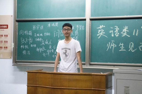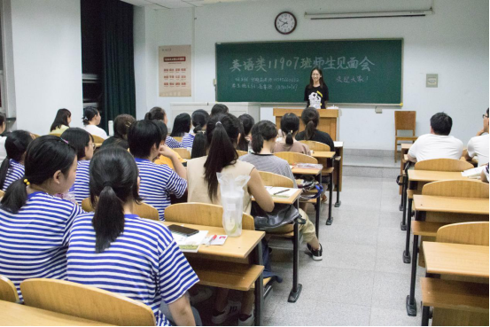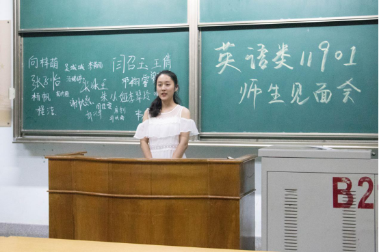 见面会伊始的自我介绍环节,教室里便此起彼伏地充斥着热烈的掌声。同学们第一次站上大学教室的讲台上,在黑板上书写下自己的名字,彰显着各位新生们已经在自己老员工活的起点上留下了浓墨重彩的一笔。紧接着,他们又用精彩的自我介绍让其他同学认识自己。他们不仅介绍了自己的家乡、兴趣爱好等,有的同学甚至讲到了自己的外号,以新奇而有趣的方式让其他同学了解了自己;有的同学说自己喜欢哆啦A梦,因此身材也向着它发展……精彩纷呈的介绍让整个见面会轻松而活跃。其中,英语类六班的老师则给同学们提出了一个小规则,让本就精彩的自我介绍更加别开生面。老师要求同学们在介绍自己前,先回忆一遍在自己前面做自我介绍的同学的名字,说说自己的前后左右是谁,然后再用家乡话进行自我介绍。于是大家听到了来自湖北、山东、广东、江苏、天津等各个地方的同学们所讲的方言,在感受到地域文化差异的同时,也感受到了大学的丰富多彩。