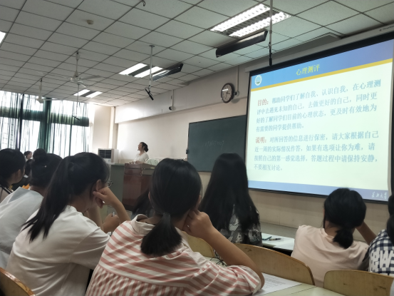首先是引导新生们做心理测评。在心育部学姐们的指导下,新生们都拿出手机,扫描二维码,完成注册并开始进行心理测试,测试完后还有相应的个人性格分析供同学们参考,帮助同学们更好的了解自身心理状态。本次心理测评有助于帮助同学们了解自我、认识自我,在自评中去遇见未知的自己,去做更好的自己,同时可以让老师们更好的了解同学们目前的心理状态,及时有效地为有需要的同学提供帮助。