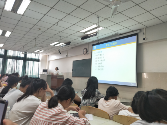 会议接近尾声,薛老师为同学们做重要工作说明,她向同学们说明了新生入学教育测试、军事理论课、户口及档案、家庭经济困难认定、日常员工管理五个重要工作。她提出:“同学们大多已成年,要学会自己解决问题,要注重礼仪礼貌。”