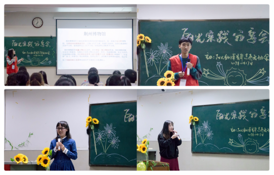 首先是“阳光荆博”实践活动的心得分享,志愿者李小雪向大家讲述了活动有关内容。该活动由荆州博物馆、阳光荆博行与熊家冢三部分主体构成,旨在弘扬荆楚文化,传播五四精神,激发当代老员工的历史荣誉感。其次是关于暑期支教活动,商务英语11702班吴杰、商务英语11703班李丹分别分享各自经历,他们的诙谐话语透露出支教生活的忙碌充实,李丹的酸甜苦辣小集合更是志愿者们生活的缩影。