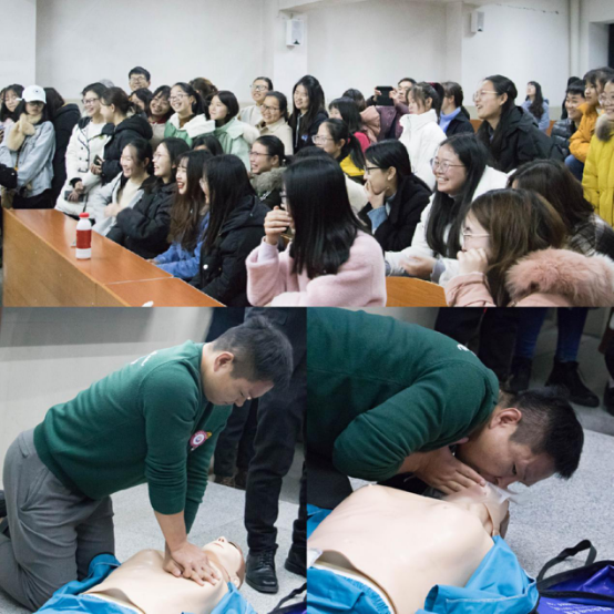 针对心源性猝死,他强调救护车到来前的10分钟是关键,和志愿者以及同学们共同演示了拨打急救电话,确认环境,检查呼吸,胸外按压的方法和注意事项,人工呼吸,AED除颤的使用等内容,并且对每个动作要领进行说明,建议大家普及推广胸外按压。同学们在实践中受益匪浅,初步了解到猝死自救与他救的知识。现场同学们积极参与,讲座气氛十分活跃。