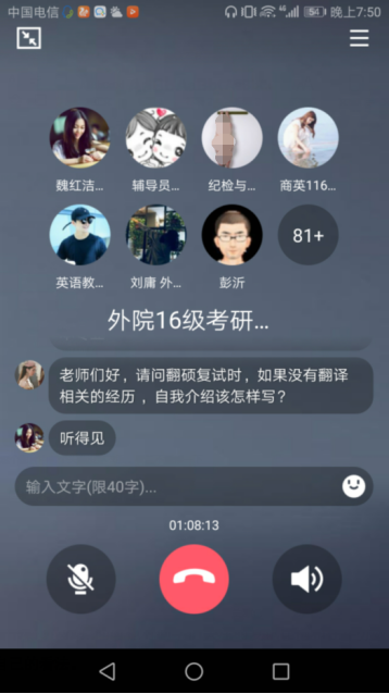 在新冠肺炎防控严峻阶段,随着全国研究生考试初试成绩陆续放榜,国家线还没有公布的情况下同学们宅在家中怎么准备复试呢?为了更好地服务考研学子,公司学工办开展了以“考研复试”为主题的学情调查,并于2月28日晚7点在公司考研交流QQ群里举办了语音答疑交流会。会议邀请到研究生导师谈宏慧,谢家成,彭沂,田传茂,陈松松等5位老师为同学们答疑解惑,有85人同时在线参会。