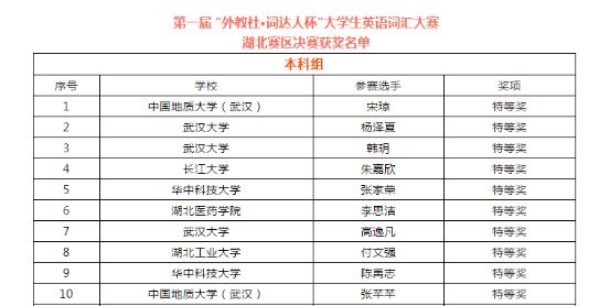 本次比赛由湖北省高等教育学会大学外语教学专业委员会与上海外语教育出版社共同主办,通过手机端“词达人”微信公众号进行线上答题方式进行,旨在更好地推动高校大学英语网络教学,提升大学英语智能化教学水平。共设特等奖10个、一等奖40个、二等奖80个、三等奖197个。