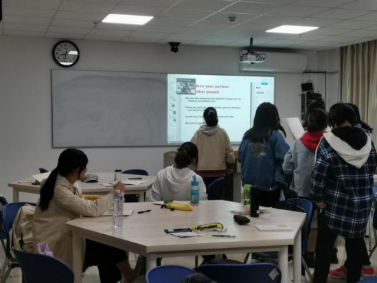课堂上,大家都显得很积极主动,Bob老师先作了自我介绍,然后布置了本次课堂的第一个任务:请同学们找一个搭档进行互相的自我介绍。愉快的氛围中,员工们很快的便完成了该项任务。此时,Bob老师发布了下一个任务,向第三个同学介绍自己的搭档,介绍完之后,需要与自己的搭档一起来到屏幕前与外教连麦,进行一对二的对话。课堂任务布置完毕,本就活力四射的教室变得更加热闹了。员工们排成长长的一队,与外教欢快地交流。