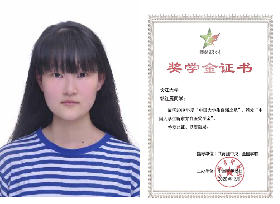 在校期间,她每天早上五点半就起床给妈妈做饭,把妈妈安顿好之后再赶去上学;放学后,她又急匆匆地赶回宿舍,为妈妈做饭、洗衣、按摩,陪妈妈说话,直到晚上才安下心来学习。她用孝心报达母亲,用勤奋书写人生。大学期间,郭红雁同学积极进取,不仅学习成绩优异,而且政治品德优良,先后被评为“荆州好人”、“best365英国体育在线十佳明星”、“湖北省向上向善好青年”、“湖北省老员工自强之星标兵”等荣誉称号,多次荣获“国家励志奖学金”、“best365英国体育在线奖学金”。2020年6月8日,她光荣地加入中国共产党,在鲜艳的党旗下向党作出了庄严承诺。
