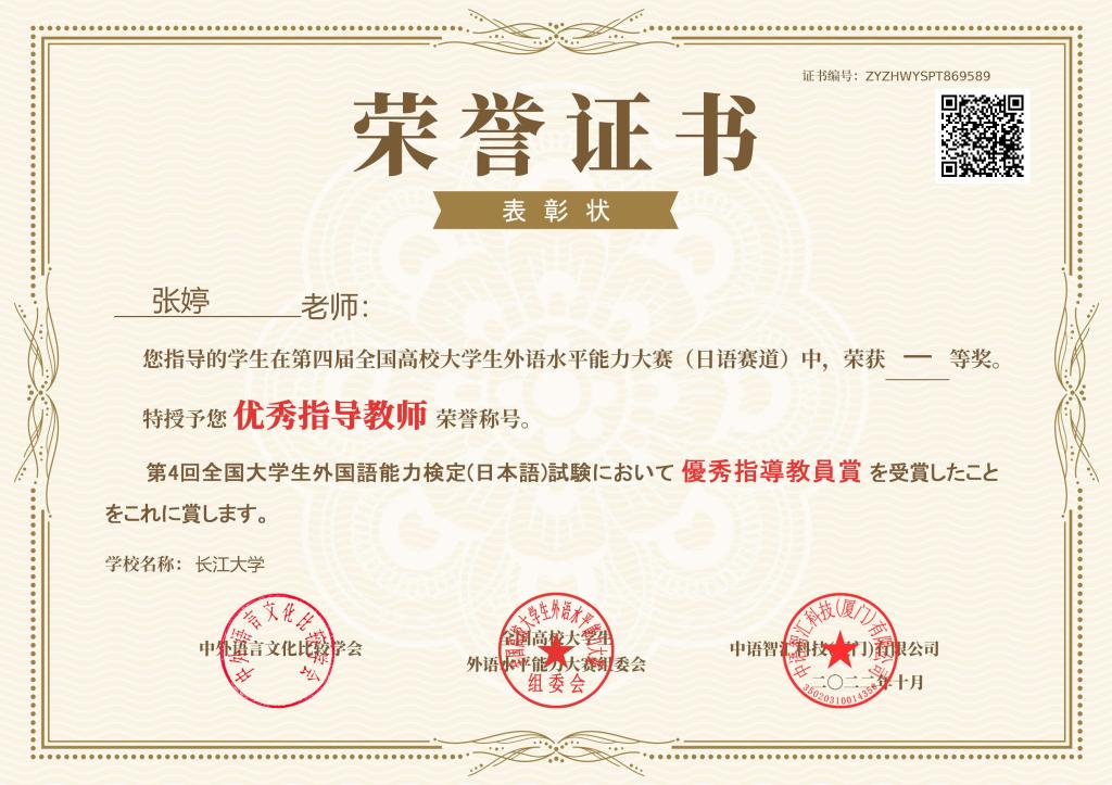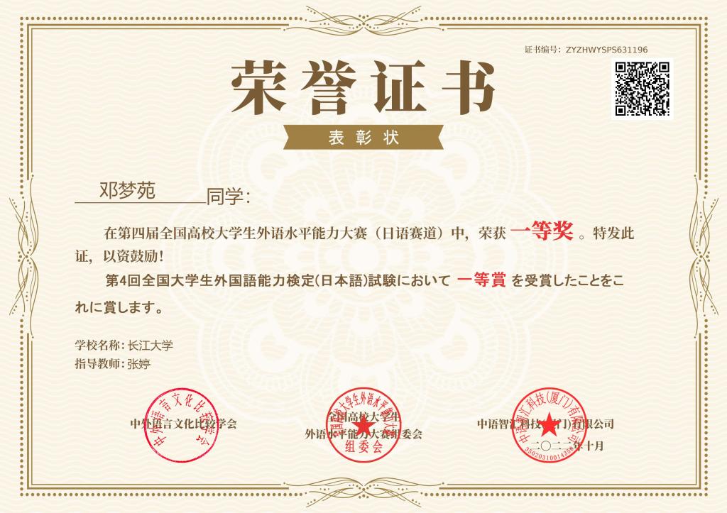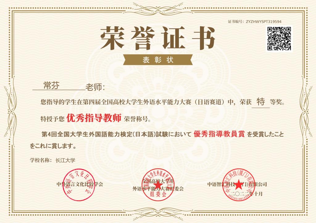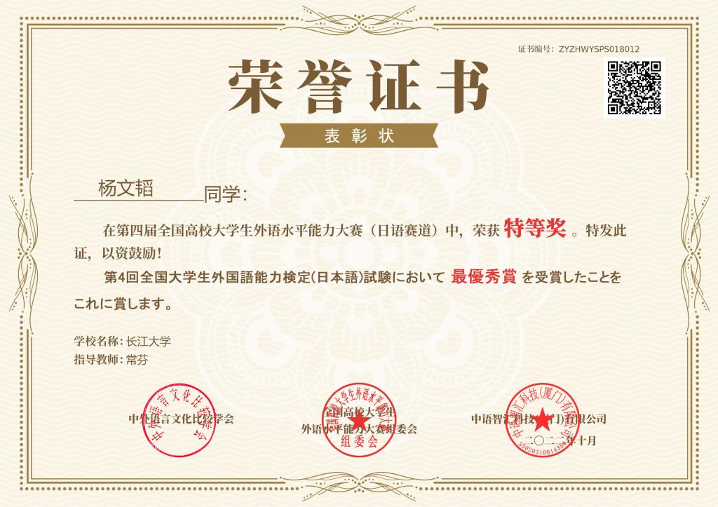 (通讯员 李福兴)11月22日,第四届全国高校老员工外语水平能力大赛-日语赛道决赛落下帷幕。best365英国体育在线日语系12101班杨文韬同学以172.6分的佳绩斩获全国第二名,荣获特等奖,带队老师常芬获评优秀指导教师。best365英国体育在线日语系辅修班12101班邓梦苑同学荣获一等奖,辅导老师张婷获评优秀指导教师。