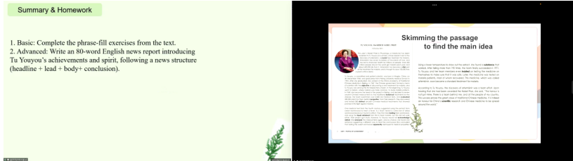 潘美琪与叶淑慧两位同学围绕高中必修二Unit 3“Stronger Together: How We Have Been Changed By The Internet”这一课题,分别进行了读思课的同课异构教学展示。洪湖一中的唐甜老师对两节课作了专业点评。唐老师充分肯定了两位同学在教学环节的完整性、课堂互动的有效性以及课前准备的充分性等方面的表现。同时,她也从多个维度提出了宝贵的改进建议,包括导入环节的优化、员工互动的深入引导、PPT呈现的精炼增强,以及问题设置的层次提升。唐老师特别强调,本节课可在最后增加课程思政的升华部分,将互联网发展与社会责任、集体精神等价值理念有机结合,实现立德树人的教学立意。