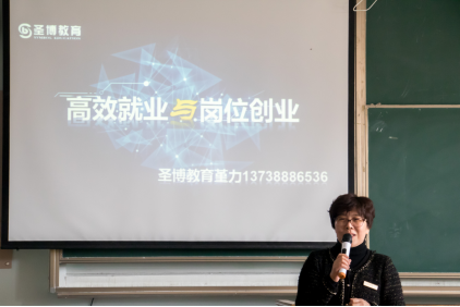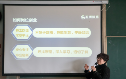 首先张涛老师介绍董事长以及圣博教育,随后刘董事长正式开始向同学们分享自己的经验。关于读研与否的问题,她表示,这是两条截然不同的路,选择考研就是要做专业性、研究性人才进入社会就是要实际地通过工作来学习与提升,无论走哪条路,都要有终身学习的理念,放弃“吃老本”的想法。她的第二个重点就是告诉同学们如何高效就业,并从两个角度阐述了这个问题。从企业的选择上来看,一个好的企业应具有核心竞争力、领导人开拓创新、规模适中,提速发展四个质。从求职者本身来看,新人求职应该必备抛弃幻想,抓住机会、脚踏实地、注重细节以及参考专业五个原则。紧接着,刘董事长讲述了如何岗位创业她表示,只有做到持之以恒,不受干扰,专心专注,专业创新才能岗位成才。