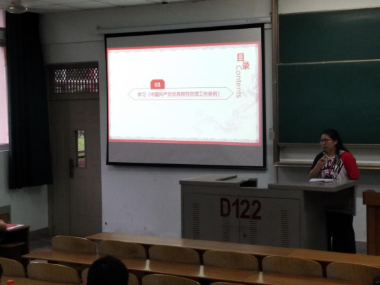在集中学习《中国共产党党员教育管理工作条例》时,童老师重点解读了党员教育管理的指导思想、原则、基本任务、主要方式、党籍与组织关系的管理这五个方面的内容。同时强调了党员需要认真参与组织生活,严肃学习气氛,提高学习意识,服从管理,永葆共产党人的政治本色。