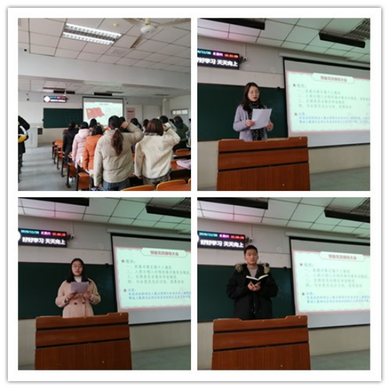 参加活动的全体党员在吴杰同学的领誓下重温了入党誓词。随后石月月、柳娜、葛涛、陈舒、张婷婷等同学领读了党章第九、十、十一章关于党组、党和共青团的关系、党徽党旗的具体内容,罗歌、李文佳、吴杰、彭秦、宋汶霏、万嘉琦、黄丹妮、史文双、王玲、牟霖子、吴晓纯、高宁等同学领读了《习近平关于“不忘初心、牢记使命”论述摘编》的第六章和第七章的部分内容。