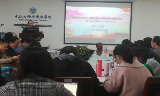 涂江波博士首先对《习近平谈治国理政》第三卷的逻辑框架、编辑体例风格等进行了介绍,讲述了制度对于国家治理的重要性。随后,他围绕“中国特色社会主义制度为什么能够具有显著优势?”这一问题,通过详实的数据、典型的事例,在对中国特色社会主义事业伟大成就进行梳理的基础上,指出中国特色社会主义制度具有显著优势源于其合乎现实、合乎规律、合乎原则、合乎价值,并从“合乎现实、合乎规律、合乎原则、合乎价值”四个方面进行了详细解读。