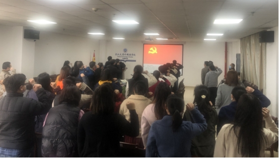 会上,在公司党委副书记程坤的领誓下,全体与会党员重温了入党誓词。公外教师党支部罗博、英语教师党支部樊辉、日语和行政教师党支部常芬等3名党员领诵了《中国共产党章程》第三章。