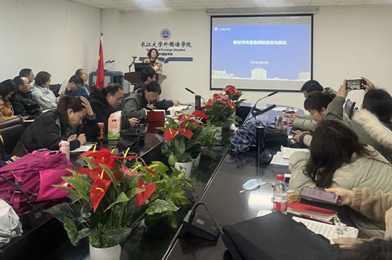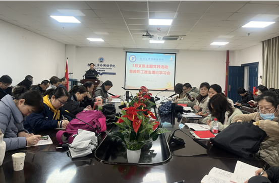 最后,经理谈宏慧以“新时代外语教师的使命与挑战”为题,给全院教职工上了一堂专题党课。她以引人深思的“教育三问(为谁培养人?培养什么样的人?怎样培养人?)”展开,用生动的语言把新时代外语教师的使命与挑战娓娓道来,让大家对“教育三问”有了更深层次的理解。她希望全院教师牢记教师的责任使命,坚持立德为先、树人为本,努力做立德树人的典范。