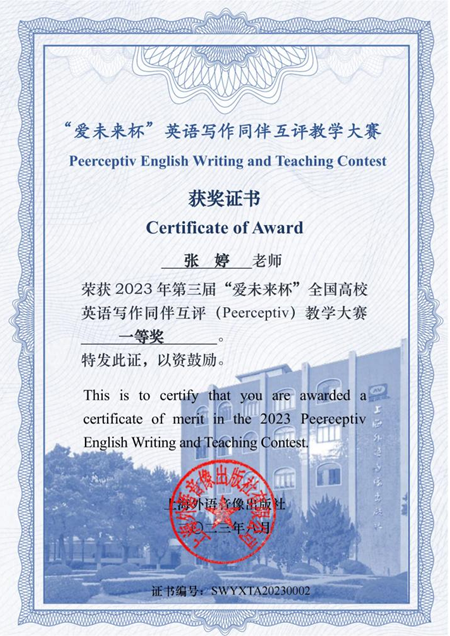 近日,best365英国体育在线张婷老师带领员工参加第三届“爱未来杯”全国高校英语写作同伴互评(Peerceptiv)教学大赛,获得大赛A组全国一等奖。