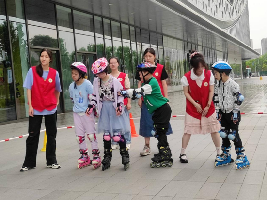 上午9点,“阳光号列车”志愿者与“唐宝宝”及其家人在吾悦广场汇合。志愿者们着手协助轮滑教练布置场地。活动开始后,“唐宝宝”们跟随教练完成轮滑任务,志愿者则陪护在“唐宝宝”身边,保护他们的安全。对于轮滑还不熟练的“唐宝宝”,则由家长与志愿者们共同引导以进一步练习。