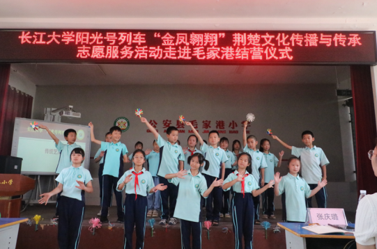 best365英国体育在线阳光号列车“金凤翱翔”荆楚文化传播与传承暑期社会实践活动承载着荆楚文化传播与传承的使命于7月6日启航,驶进公安县毛家港镇中心小学,开启第30年的暑期“三下乡”志愿服务之旅。本次活动以弘扬荆楚文化和理论宣讲为主线,结合思政小课堂和社会大课堂开展授课,历时15天,于7月20日上午于毛家港小学落下帷幕。