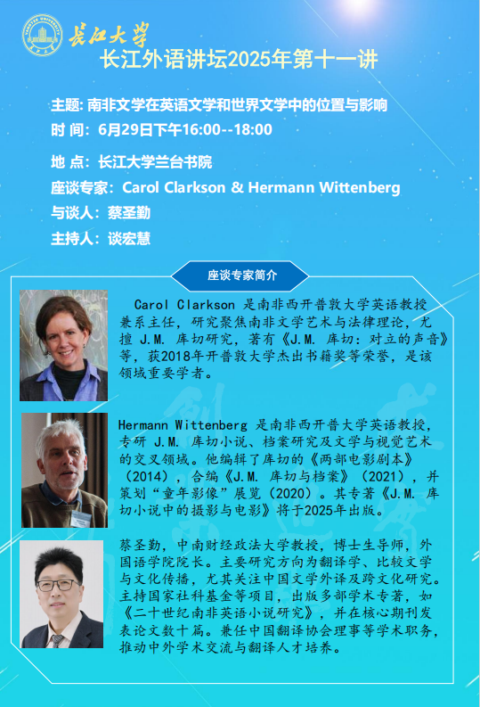 长江外语讲坛2025年第十一讲:南非文学在英语文学和世界文学中的位置与影响