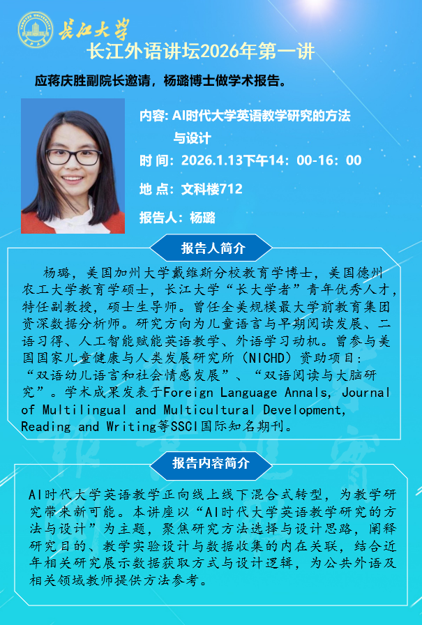 长江外语讲坛2026年第一讲:AI时代大学英语教学研究的方法与设计