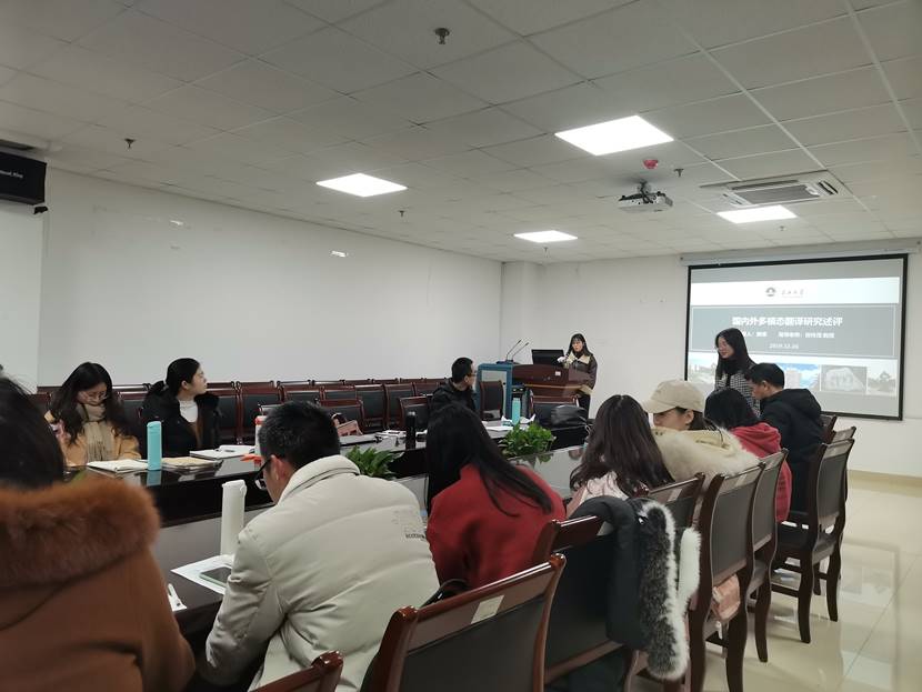 应婷同学主讲的题目是“基于语料库语言学的翻译研究”。首先,应婷同学解释了语料库语言学的定义,并用图示法清晰地展示了语料库的简单分类及应用。其次,讲解了语料库语言学对于翻译的实用性,它不仅可以指导翻译实践,还可以用于翻译教学。然后,详细介绍了基于平行语料库、多语语料库、类比语料库的翻译研究。最后,以一篇论文为例,具体解释了语料库在翻译研究中的应用。颜倩同学主讲的题目是“国内外多模态翻译研究述评”。首先,介绍了该文献综述的摘要和引言部分。接着,解释了多模态翻译的基本概念。然后,从文本构成、合成技术、传播效果三个方面讲述了多模态翻译的特点与价值。最后,总结了多模态翻译的研究领域,并对文献综述写作提出了有效的建议。