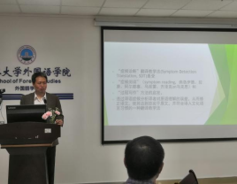此次讲座的主要内容是:介绍“症候诊断”翻译教学法的内涵,步骤,原则和MTI 专业建设的特色。刘教授首先向大家解释了“症候诊断”翻译教学法的来源和含义。接着,教授引用新疆棉的例子,概括新闻翻译的特征,提出了“德信达”的翻译原则。随后,刘教授详细介绍了“闻问望切”翻译步骤,即从听员工读译文开始,到师生和生生沟通,然后反观原文和译文,最后确定问题所在,提出建议的过程。在讲座中,刘教授提出了MTI专业员工的翻译报告要“突出问题意识,突出观点性,突出主题”的观点,为我们的MTI专业发展带来了启发。同时,刘教授还展示了很多“世界知识”的实例,引发大家对于翻译过程的思考,如“蜜瓜色”,“花见”等特殊词汇应当如何翻译。最后,刘教授还简要介绍了哈尔滨工业大学MTI专业的发展特色。