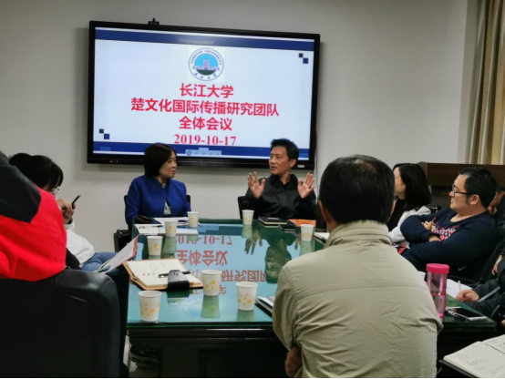 最后,公司楚文化国际传播团队成员进行了热烈的学术探讨。探讨内容如下:①问题:如何找到研究热点和新角度?结论:多从参加会议、会议综述、会训等追踪研究热点、寻找研究新思路。②问题:如何看待研究的新旧问题?结论:学术研究的新旧问题是相对的,可旧瓶装新酒,也可新瓶装旧酒。③是否有研究国外中小学教材中《楚辞》的可能?结论:目前在国外还没有《楚辞》在中小学阶段适用的普及本,当前该研究可能性不大。④可否从中观层面来进行楚文化研究。结论:民俗研究是不错的切入点。⑤问题:对楚文化国际传播过程中读者的情感因素进行研究是否可行?结论:译语读者情感因素与楚文化的国际传播效果密切相关,读者情感因素的研究比较难以把控。但是,楚文化国际传播接受效果研究十分重要,仍有较大的研究空间。