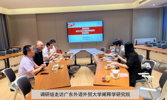 6月11日下午,调研组走访了广东外语外贸大学阐释学研究院,该院是我国阐释学研究的重要基地,在该领域有较高的学术影响力。阐释学研究院经理陈开举教授热情接待并详细介绍了阐释学的概念内涵和发展历程。他还生动地解读了荆楚文化的内涵,使调研组老师对阐释学及区域文化有了更深入的理解。双方探讨了共同建立“阐释学与荆楚文化研究”课题的可行性。广东外语外贸大学国际商务英语公司徐章宏教授、肖武东老师和阐释学研究院博士后殷立飞也应邀出席座谈。调研组与各位专家就英语专业的人才培养目标、就业情况、跨文化课程开发、访问学者项目等议题进行了深入的交流探讨。